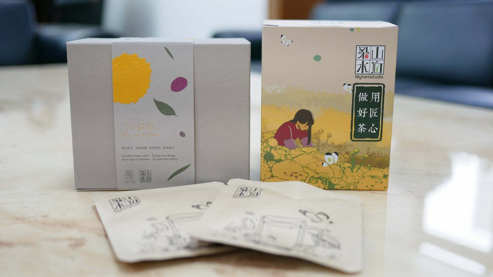 原物料得到淳頤堂的肯定後,詹又穎再花了足足2年的時間與中醫師團隊來回討論,以杭菊搭配紅棗、香草等作物為基底,設計出符合現代人於不同壓力情境下適合的多款主題茶飲...................