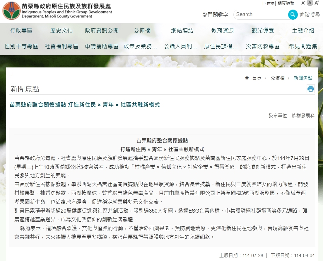 苗栗縣政府勞青處、社會處與原住民族及族群發展處攜手整合頭份新住民服務據點及苗南區新住民家庭服務中心,於114年7月29日(星期二)上午10時西湖鄉公所3樓會議室,成功推動「柑橘產業 × 信仰文化 × 社會企業 × 智慧樂齡」的跨域創新模式,打造出新住民參與地方創生的典範。
